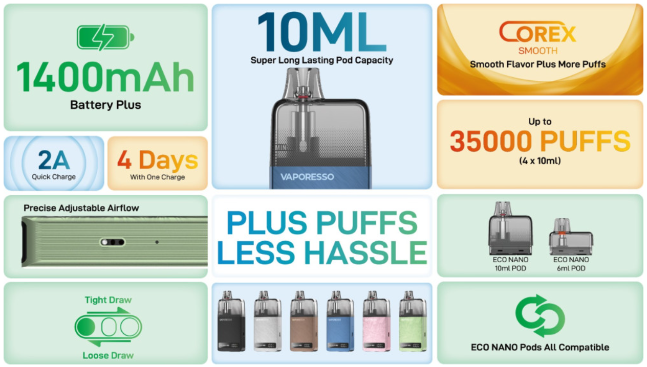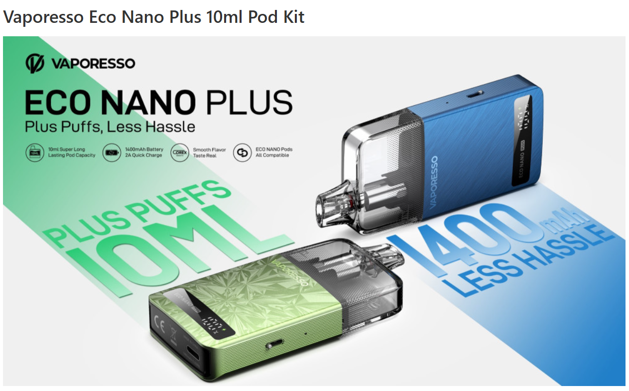 Sada VAPORESSO ECO NANO PLUS POD KIT je navrhnutá s dôrazom na pohodlie a výkon. S masívnou kapacitou 10 ml pre pod a dlhou výdržou batérie s kapacitou 1400 mAh, táto sada zabezpečuje dlhé hodiny príjemného vapovania bez častého dopĺňania.