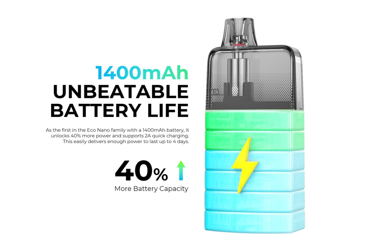 Vďaka rýchlemu nabíjaniu 2A cez Type-C a o 40 % vyššej kapacite batérie v porovnaní s predchádzajúcimi modelmi, strávite menej času nabíjaním a viac času vapovaním. Objem 10 ml znamená menej častého dopĺňania počas dňa. Sada je kompatibilná so všetkými podmi série ECO Nano, čo zaisťuje väčšiu flexibilitu.
